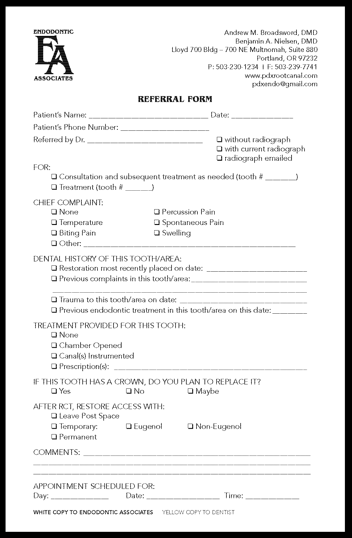 We truly appreciate the opportunity to care for your patients. We share your commitment to providing the best possible dental care for all your patients. For your convenience we now have a copy of our referral form to download: